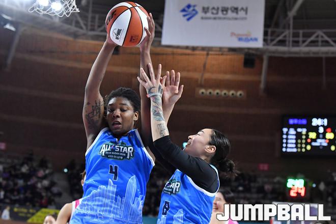 [점프볼=부산/홍기웅 기자] 12일 부산스포원파크BNK센터에서 하나원큐 2019-2020 여자프로농구 올스타전이 열렸다. 블루스타 마이샤가 리바운드를 잡아내고 있다.