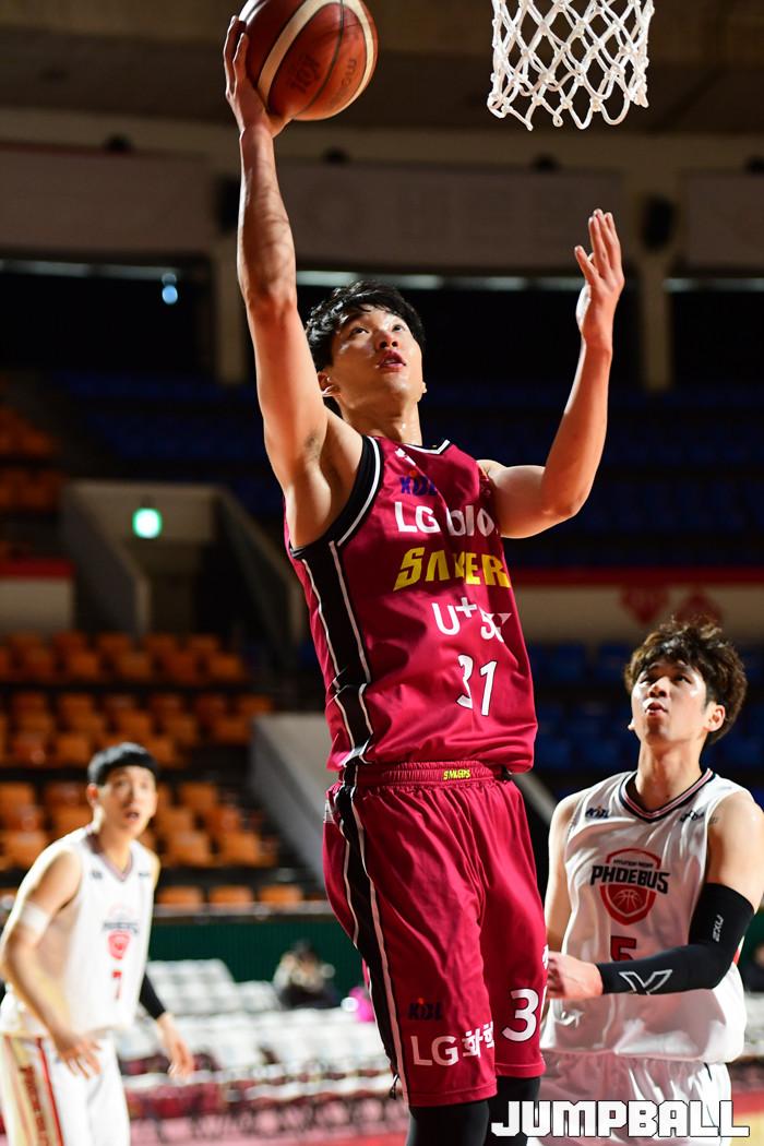 [점프볼=잠실학생/박상혁 기자] 13일 잠실학생체육관에서 열린 '2019-2020 KBL D-리그' 창원 LG와 울산 현대모비스의 경기, LG 박인태가 골밑슛을 시도하고 있다.