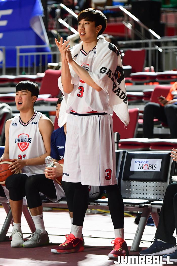[점프볼=잠실학생/박상혁 기자] 13일 잠실학생체육관에서 열린 '2019-2020 KBL D-리그' 창원 LG와 울산 현대모비스의 경기, 벤치에 있는 현대모비스 이진석이 슛이 성공되자 환호하고 있다.
