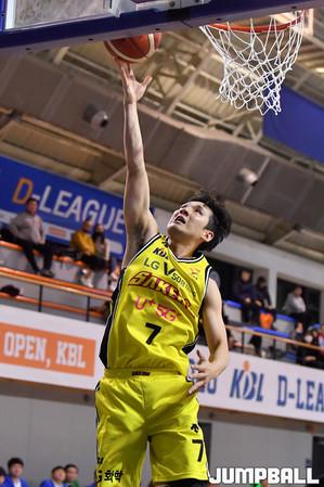[점프볼=신촌/홍기웅 기자] 3일 연세대학교 신촌캠퍼스 체육관에서 열린 '2019-2020 KBL D리그' 창원 LG와 국군 상무의 경기. 상무 박세진이 골밑슛을 던지고 있다.