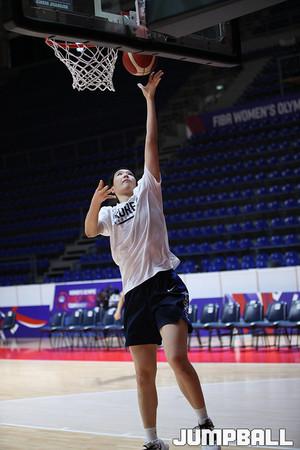 한국시간 6일 세르비아 베오그라드 알렉산드 니코리치 홀에서 열린 2020 도쿄올림픽 여자농구 최종 예선전 한국과 스페인의 경기, 한국 대표팀의 김단비가 드리블 돌파에 이어 점프슛으로 득점을 노리고 있다.