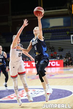 대한민국 여자농구 대표팀은 8일 세르비아 베오그라드 알렉산드라 니코리치 홀에서 열린 2020 도쿄올림픽 여자농구 최종예선 C조 영국과의 경기. 한국대표팀의 강이슬이 영국의 수비를 뚫고 베이스라인을 파고 들며 골밑으로 다가서고 있다.