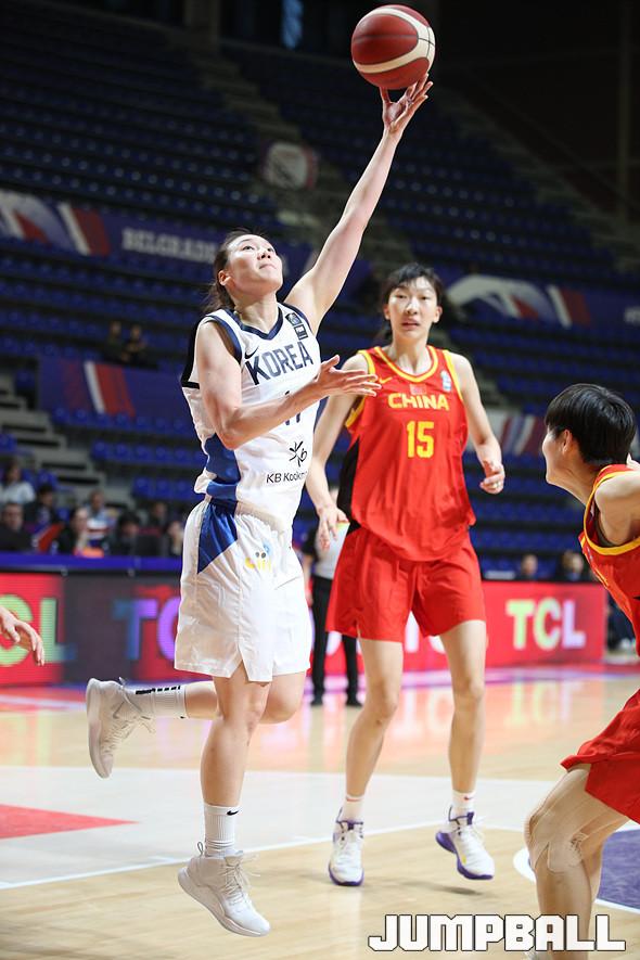 대한민국 여자농구 대표팀은 9일 세르비아 베오그라드 알렉산드라 니코리치 홀에서 열린 2020 도쿄올림픽 여자농구 최종예선 C조 중국과의 마지막 경기. 한국 대표팀의 배혜윤이 수비를 피해 골밑 득점을 만들어 내고 있다.