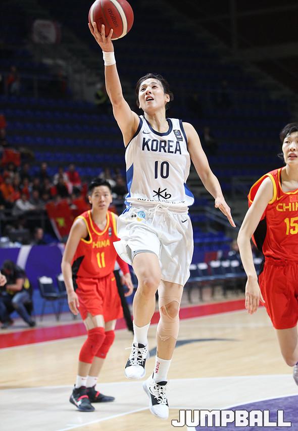 대한민국 여자농구 대표팀은 9일 세르비아 베오그라드 알렉산드라 니코리치 홀에서 열린 2020 도쿄올림픽 여자농구 최종예선 C조 중국과의 마지막 경기. 한국 대표팀의 김단비가 재빠르게 수비를 제치고 레이업슛을 시도하고 있다.