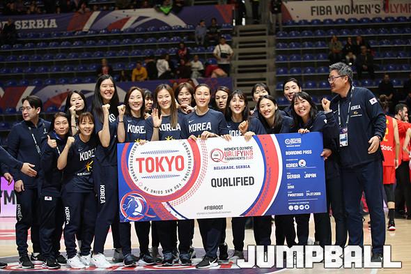 9일 세르비아 베오그라드 알렉산드라 니코리치 홀에서 열린 2020 도쿄올림픽 여자농구 최종예선 C조 스페인과 영국의 경기가 스페인의 승리로 끝이 나면서 한국 대표팀이 조3위로 올림픽 출전권을 획득한 뒤 기념촬영을 하고 있다.