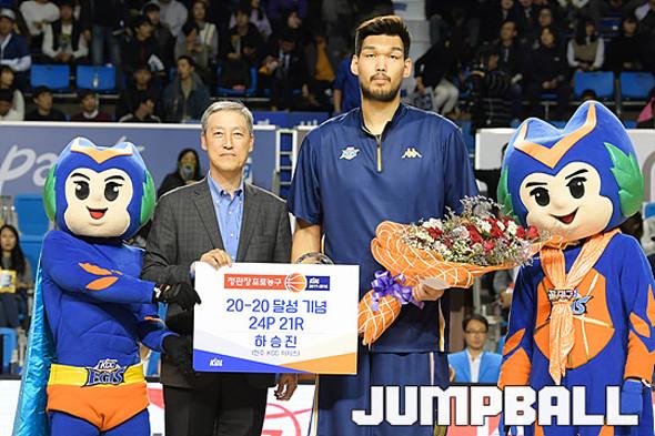 KBL 최초의 국내선수 20-20은 현재는 은퇴한 ‘하킬’ 하승진이 첫 기록 보유자다. 2015-2016시즌 마지막 정규경기였던 2월 21일, KGC인삼공사 전에서 24득점 21리바운드를 기록한 것이다.