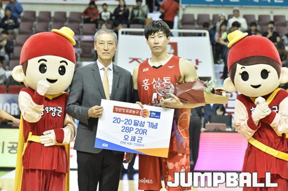 KBL은 오세근의 20-20을 기념하기 위해 별도의 시상을 준비했다. 2017년 10월 26일 안양실내체육관에서 열린 SK 전에 앞서 기념상을 전달한 것. 이후 최초의 기록자인 하승진에게도 기념상이 전달되며 축하했다.