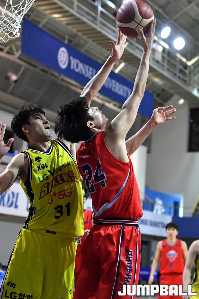 [점프볼=신촌/홍기웅 기자] 20일 연세대학교 신촌캠퍼스 체육관에서 열린 '2019-2020 KBL D리그' 창원 LG와 울산 현대모비스의 경기. 현대모비스 박준은이 블록슛을 피해 리버스 레이업을 올려넣고 있다.