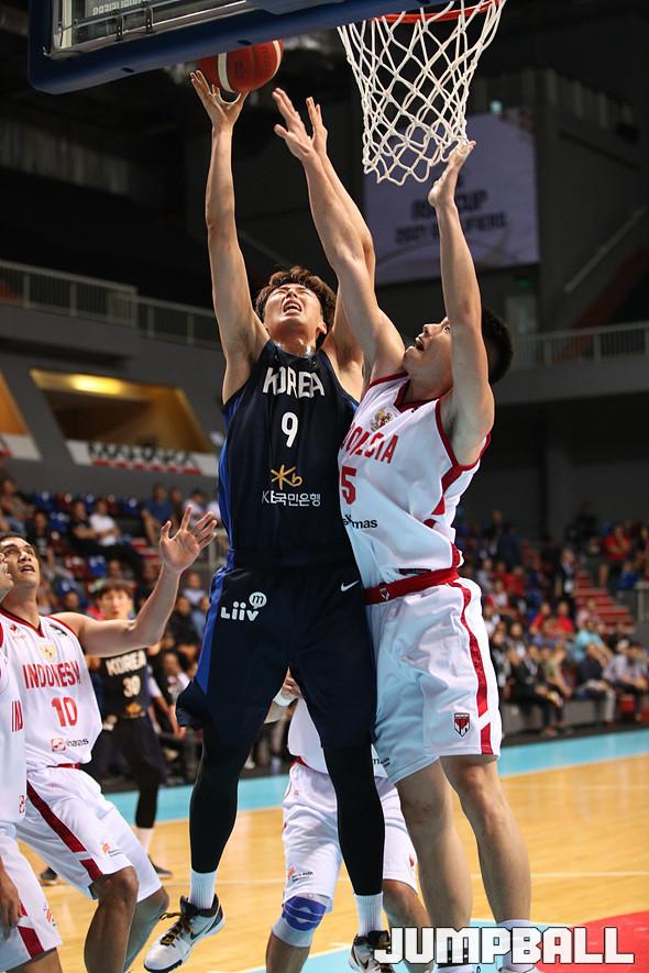 대한민국 남자농구대표팀이 20일 인도네시아 자카르타 브릿 아마 아레나에서 열린 국제농구연맹(FIBA) 아시아컵 예선(WINDOW-1) 인도네시아와의 경기, 1쿼터 송교창이 베이스라인을 파고 들어 골밑 득점을 만들어 내고 있다.