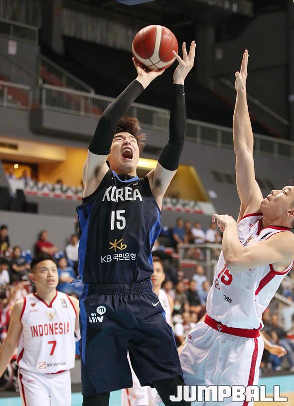 대한민국 남자농구대표팀이 20일 인도네시아 자카르타 브릿 아마 아레나에서 열린 국제농구연맹(FIBA) 아시아컵 예선(WINDOW-1) 인도네시아와의 경기, 경기 초반 부터 김종규가 의욕적으로 인도네시아의 골밑을 공략해 나가고 있다.