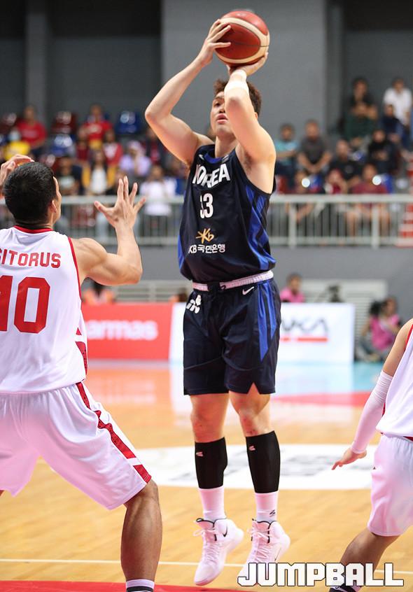 대한민국 남자농구대표팀이 20일 인도네시아 자카르타 브릿 아마 아레나에서 열린 국제농구연맹(FIBA) 아시아컵 예선(WINDOW-1) 인도네시아와의 경기, 한국 대표팀의 이승현이 오픈 찬스에서 차분하게 중거리슛을 던지고 있다.
