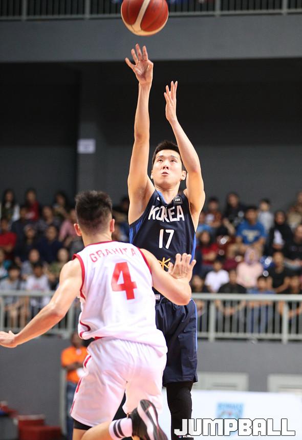 대한민국 남자농구대표팀이 20일 인도네시아 자카르타 브릿 아마 아레나에서 열린 국제농구연맹(FIBA) 아시아컵 예선(WINDOW-1) 인도네시아와의 경기, 한국 대표팀의 전준범이 빠른 슛타이밍을 이용해 3점슛을 쏘아 올리고 있다.