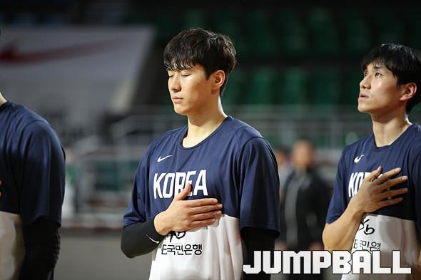23일 잠실학생체육관에서 열린 국제농구연맹(FIBA) 아시아컵 2021 예선 한국과 태국의 A조 두 번째 경기에 앞서 애국가가 연주되자 경건한 자세로 경기 시작을 준비하고 있다.