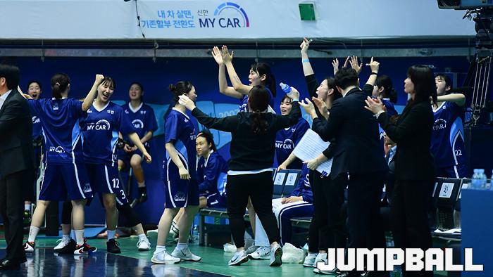 [점프볼=인천/박상혁 기자] 4일 인천도원실내체육관에서 열린 '하나원큐 2019-2020 여자프로농구' 신한은행과 삼성생명의 경기, 코트에 있는 신한은행 선수의 득점이 성공되자 벤치에 있는 선수들이 환호하고 있다.