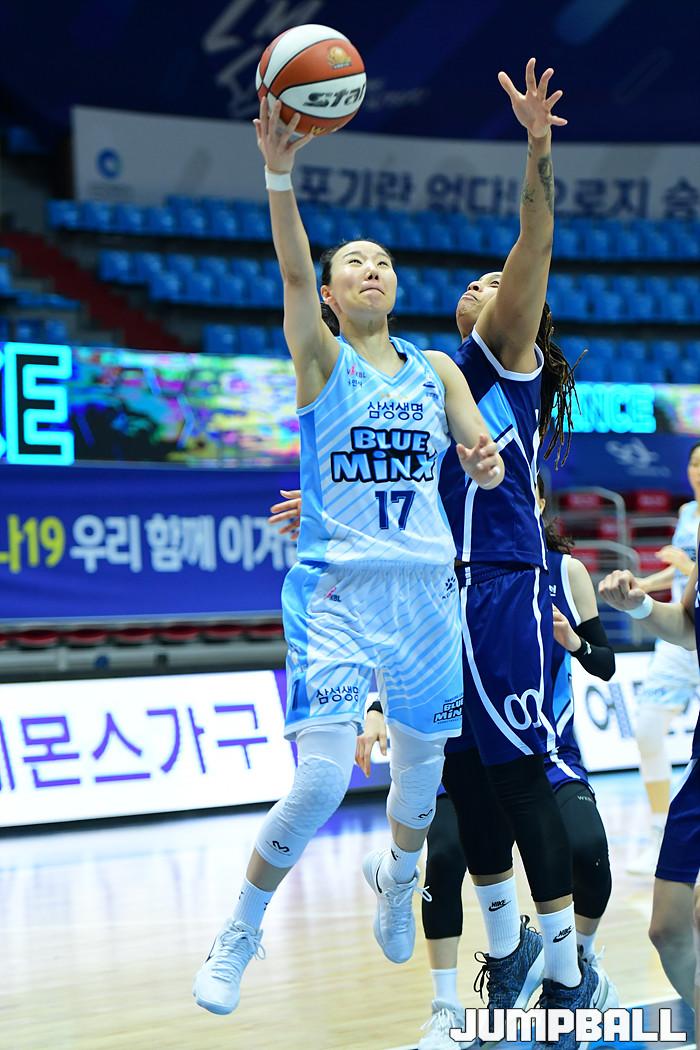 [점프볼=인천/박상혁 기자] 4일 인천도원실내체육관에서 열린 '하나원큐 2019-2020 여자프로농구' 신한은행과 삼성생명의 경기, 삼성생명 김보미가 레이업 슛을 시도하고 있다.
