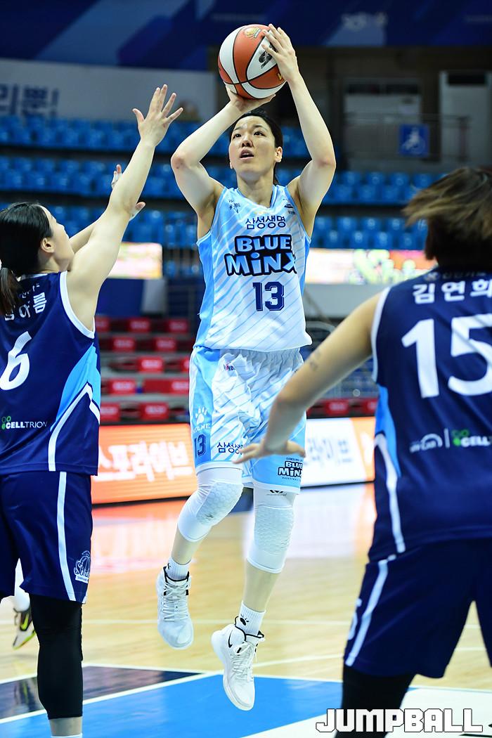 [점프볼=인천/박상혁 기자] 4일 인천도원실내체육관에서 열린 '하나원큐 2019-2020 여자프로농구' 신한은행과 삼성생명의 경기, 삼성생명 양인영이 점프슛을 시도하고 있다.