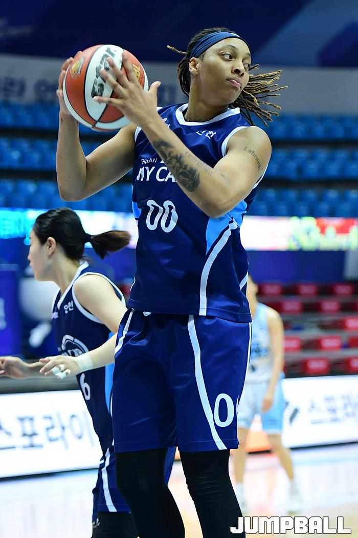 [점프볼=인천/박상혁 기자] 4일 인천도원실내체육관에서 열린 '하나원큐 2019-2020 여자프로농구' 신한은행과 삼성생명의 경기, 신한은행 서덜랜드가 리바운드를 잡아내고 있다.