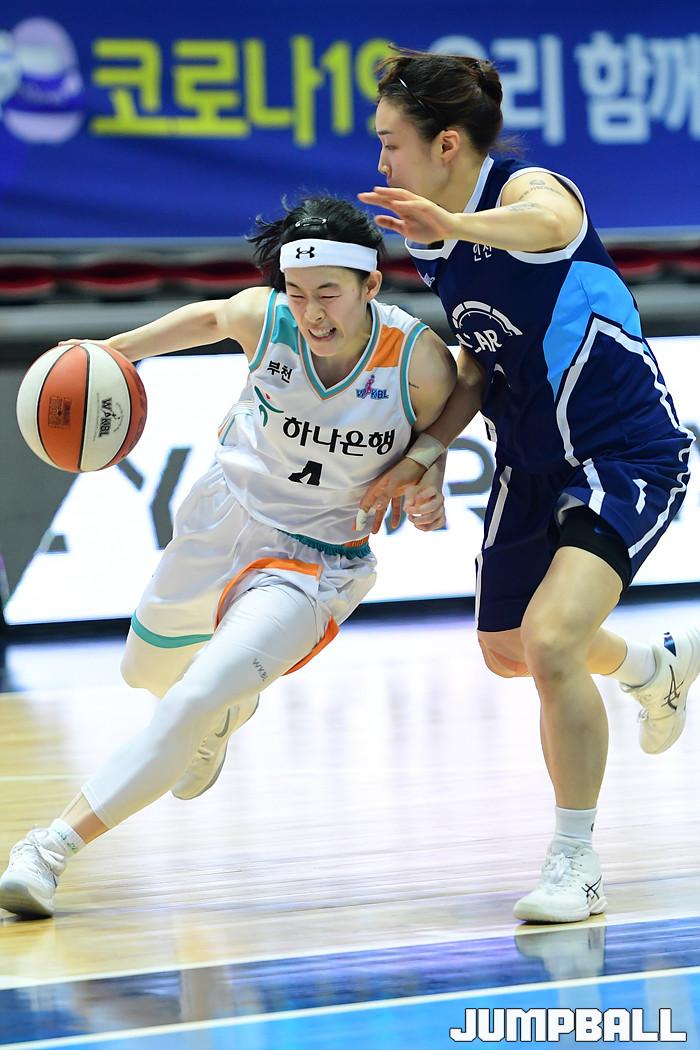 [점프볼=인천/박상혁 기자] 9일 인천도원체육관에서 열린 '하나원큐 2019-2020 여자프로농구' 신한은행과 하나은행의 경기, 하나은행 강계리가 돌파를 시도하고 있다.