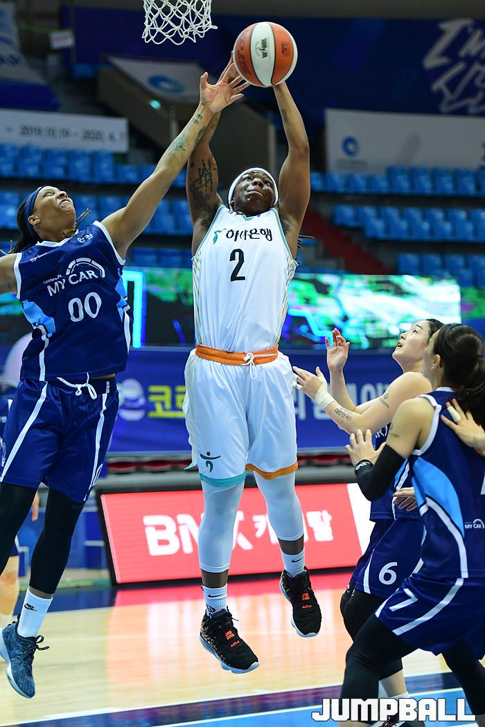 [점프볼=인천/박상혁 기자] 9일 인천도원체육관에서 열린 '하나원큐 2019-2020 여자프로농구' 신한은행과 하나은행의 경기, 하나은행 마이샤가 리바운드를 잡아내고 있다.