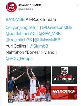 이 가운데, 한국의 유망주 이현중이 애틀랜틱 10 컨퍼런스 올-루키 팀에 선정됐다. 이현중은 제이미슨 배틀(조지 워싱턴 대학), 트레이 미첼(UMASS), 유리 콜린스(세인트 루이스), 나션 하이랜드(VCU)와 함께 2019-2020시즌에 컨퍼런스를 빛낸 최고의 신인 대열에 서게 됐다.