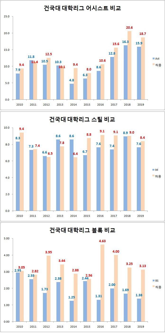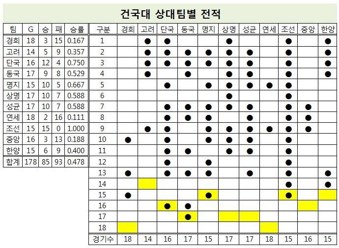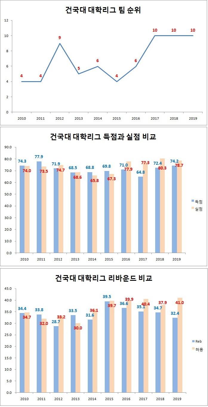 그렇지만, 최근 4년 연속 5할 승률 아래로 밑돌아 5할 이상 승률을 까먹었다. 플레이오프 진출 단골 손님이었던 건국대는 2017년부터 3년 연속 10위에 머물렀다.