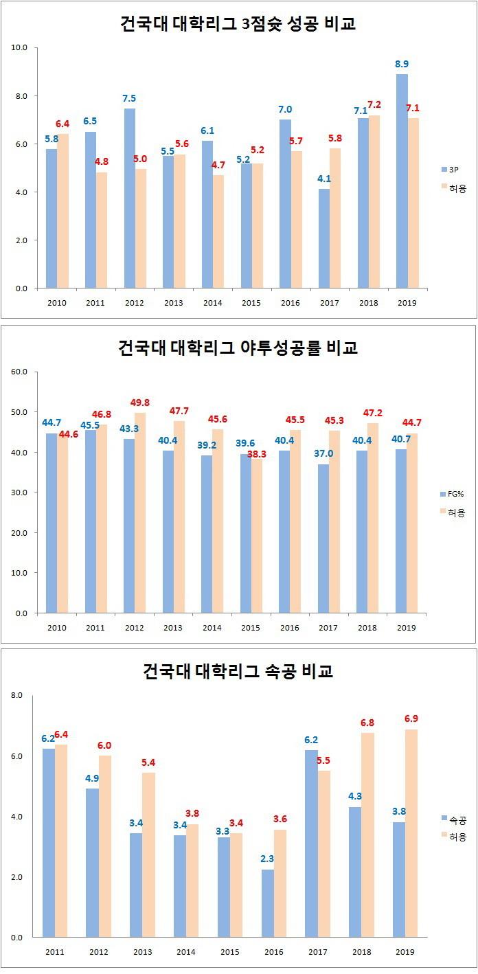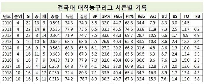 [점프볼=이재범 기자] 2020 KUSF 대학농구 U-리그는 애초 3월 16일 개막 예정이었다. 이를 23일로 연기한 뒤 신종 코로나 바이러스 감염증(코로나19)이 확산되며 개막을 다시 한 번 더 미뤘다. 현재로선 6월이나 7월 중 개막할 것으로 예상된다. 지난 10년 동안 쌓인 기록 중심으로 각 팀 전력을 살펴보며 대학농구리그 개막 연기의 아쉬움을 달랜다. 첫 번째로 살펴볼 팀은 3년 연속 10위에 머문 뒤 4년 만에 플레이오프 진출에 도전하는 건국대다.