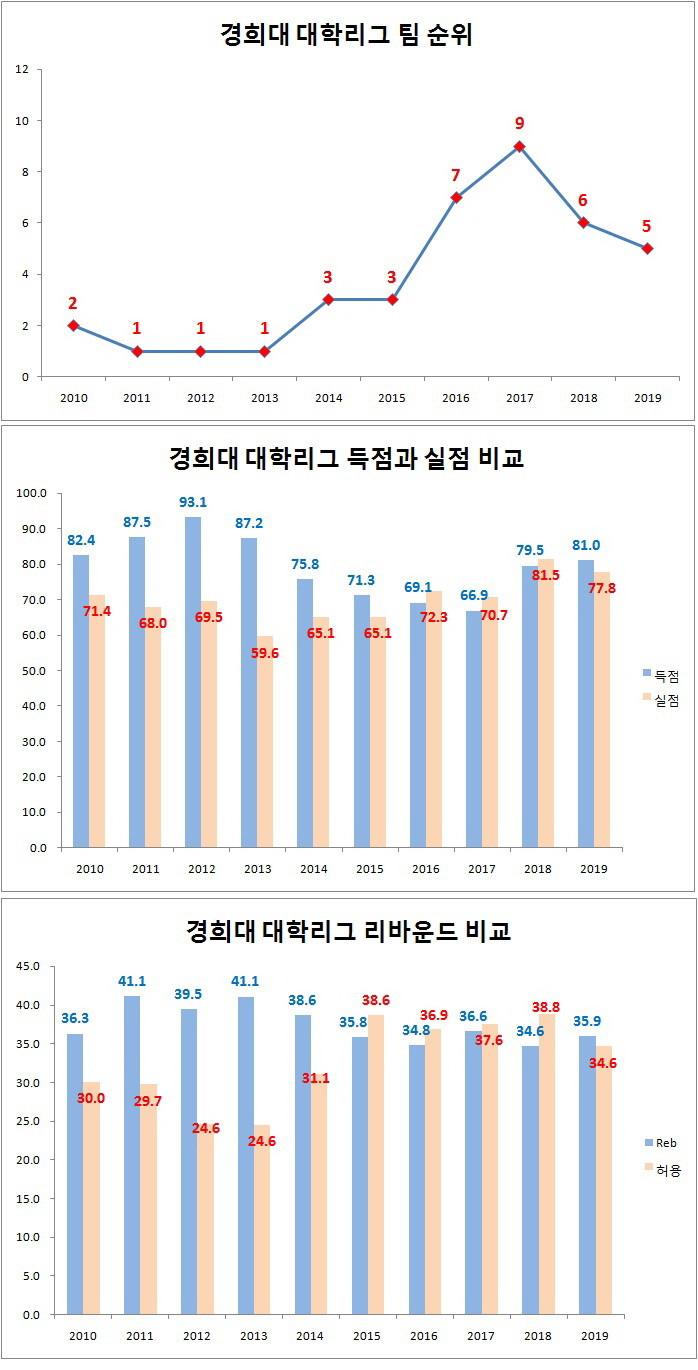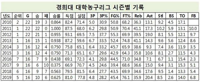 [점프볼=이재범 기자] 2020 KUSF 대학농구 U-리그는 애초 3월 16일 개막 예정이었다. 이를 23일로 연기한 뒤 신종 코로나 바이러스 감염증(코로나19)이 확산되며 개막을 다시 한 번 더 미뤘다. 현재로선 6월이나 7월 중 개막할 것으로 예상된다. 지난 10년 동안 쌓인 기록 중심으로 각 팀 전력을 살펴보며 대학농구리그 개막 연기의 아쉬움을 달랜다. 두 번째로 살펴볼 팀은 첫 플레이오프 탈락 후 점점 순위를 끌어올리고 있는 경희대다.