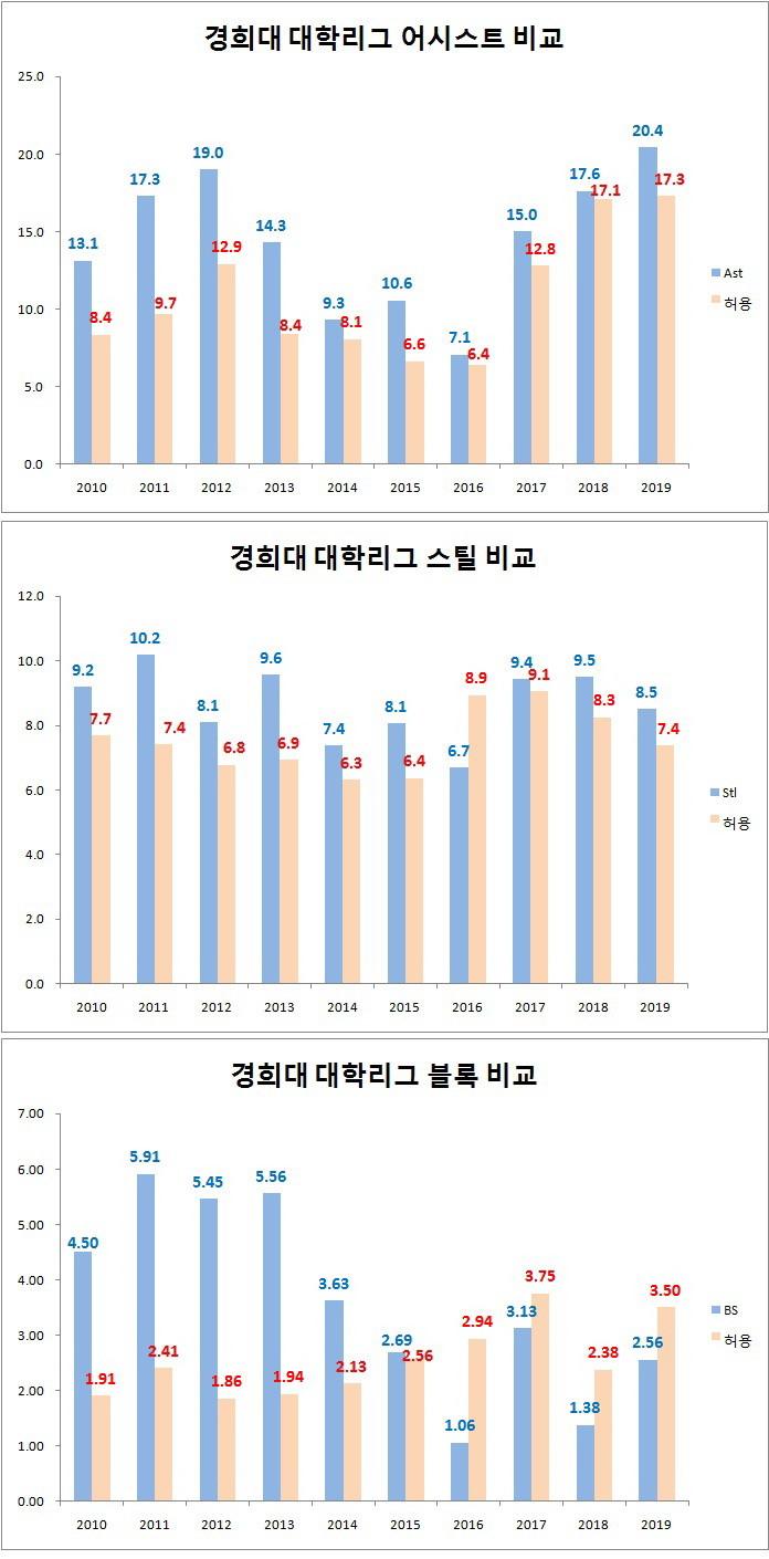 여담으로 경희대는 2017년 동국대, 한양대와 6승 10패로 동률을 이뤘다고 소개했다. 2018년에는 동국대, 상명대와 9승 7패로, 2019년에는 중앙대, 단국대와 10승 6패로 동률을 기록했다. 경희대는 3년 연속으로 3팀이나 동률을 이룬 기록에 이름을 올렸다. 이번 시즌에도 이런 특이한 이력을 계속 작성할지 궁금하다.