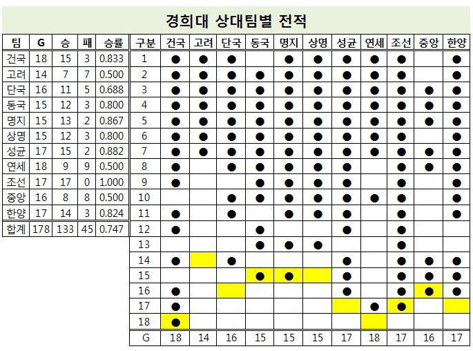 고려대는 경희대만 이기면 모든 팀을 상대로 5할 이상 기록을 지키지만, 경희대는 연세대(9승 9패), 중앙대(8승 8패)와도 승률 50%를 기록 중이다. 이번 시즌 고려대와 연세대가 우승을 다툴 것으로 예상되며, 중앙대도 상위권이 유력한 팀이다. 경희대는 이들 세 팀을 모두 꺾고 상대전적 5할 이상 기록을 이어나간다면 올해 우승까지도 바라볼 수 있다.