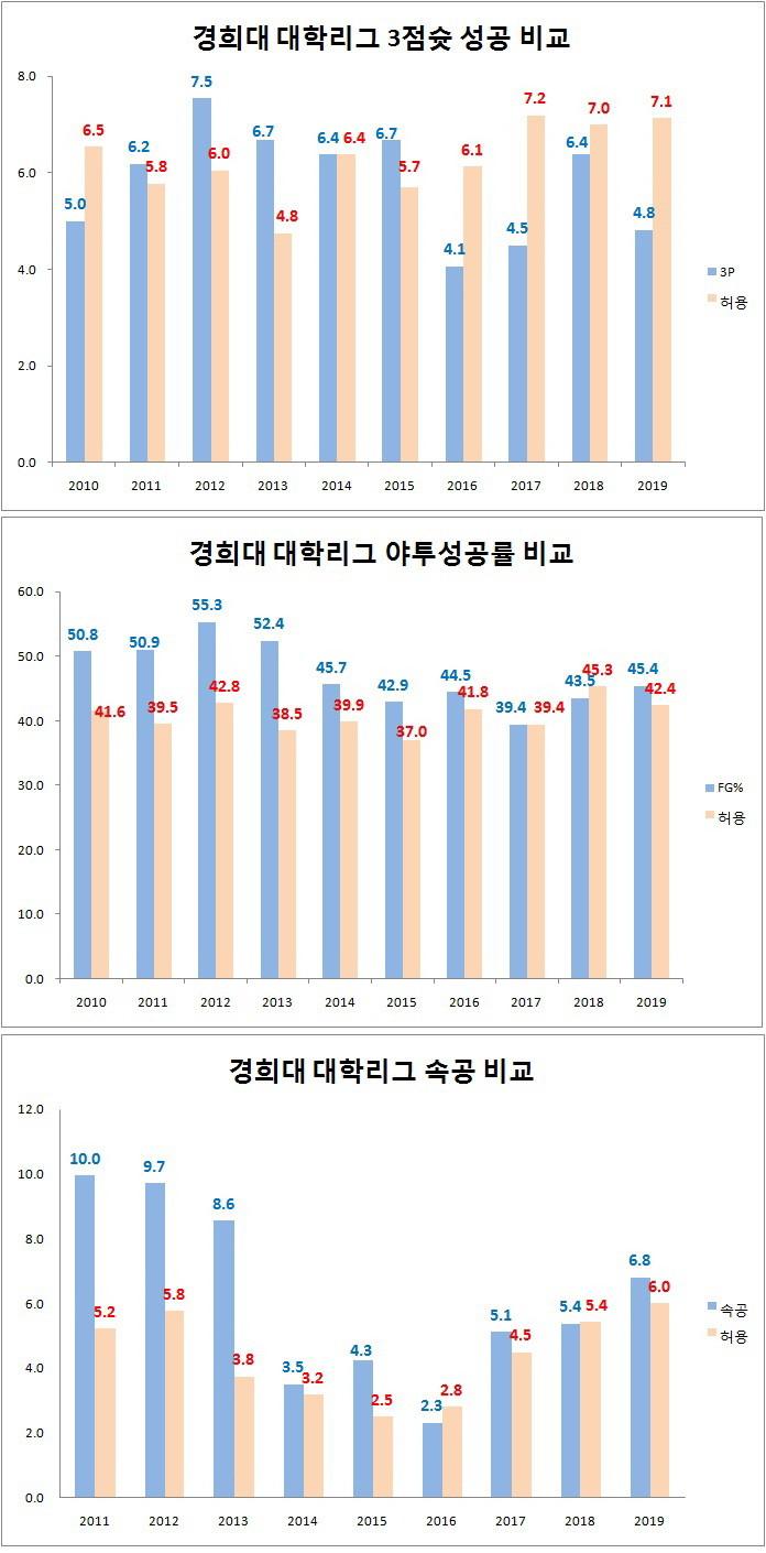 경희대 약점은 확실하다. 바로 외곽포다. 경희대는 2016년부터 지난 시즌까지 각각 4.1개, 4.5개, 6.4개, 4.8개의 3점슛을 성공한 것과 달리 상대팀에겐 각각 6.1개, 7.2개, 7.0개, 7.1개를 얻어맞았다. 흐름에 변화를 줄 수 있는 3점슛을 많이 넣지 못하는데다 성공률 역시 30% 미만으로 저조한 반면 상대에겐 더 많은 3점슛을, 30% 이상 성공률로 허용한 것이다.