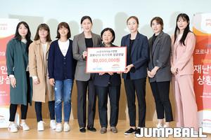 [점프볼=마포/유용우 기자] 1일 오후 서울 마포구 희망브리지 전국재해구호협회 희망브리지홀에서 ‘WKBL 선수단 코로나19 극복을 위한 기부금 전달식’이 열렸다. 이번 전달식에는 WKBL 박정은 경기운영본부장, 우리은행 박혜진, 삼성생명 박하나, 신한은행 이경은, KB스타즈 강아정, 하나은행 백지은, BNK썸 이소희가 참석하여 자리를 빛냈다.