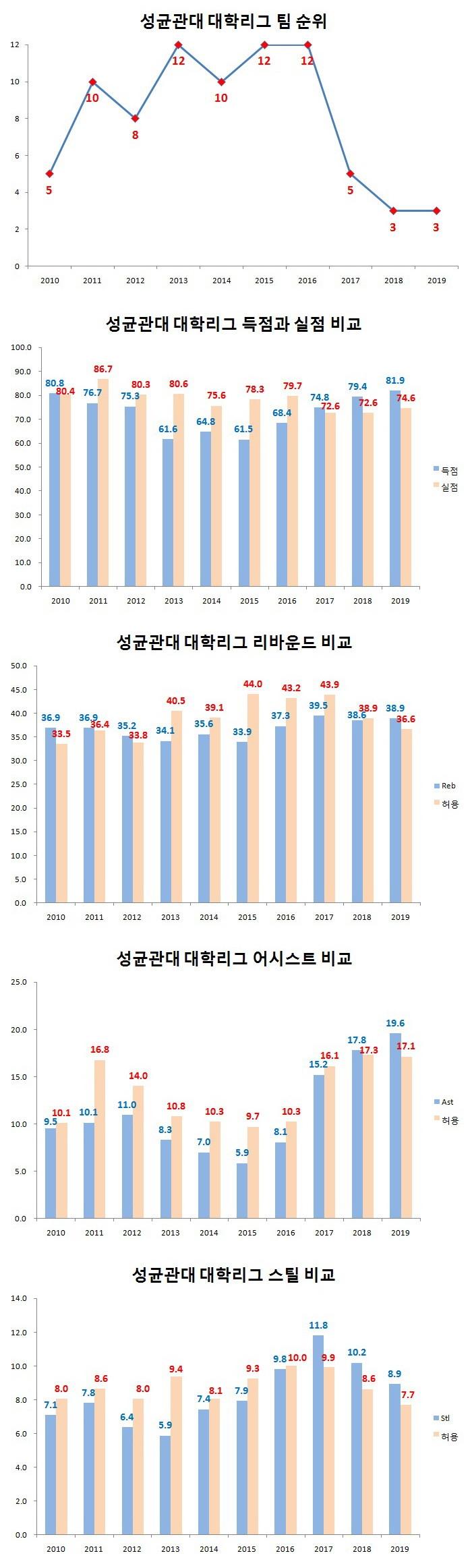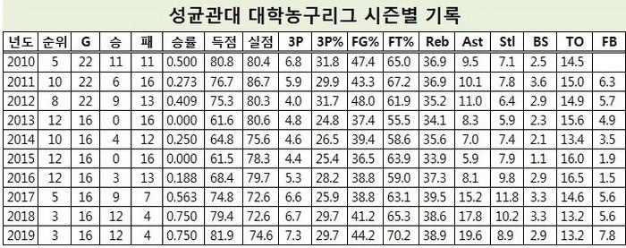 대학농구리그 원년에는 11승 11패로 5위를 차지한 뒤 2011년 10위(6승 16패), 2011년 8위(9승 13패)를 기록하며 중하위권으로 처진 성균관대는 2013년부터 최하위 전력으로 뚝 떨어진 것이다.
