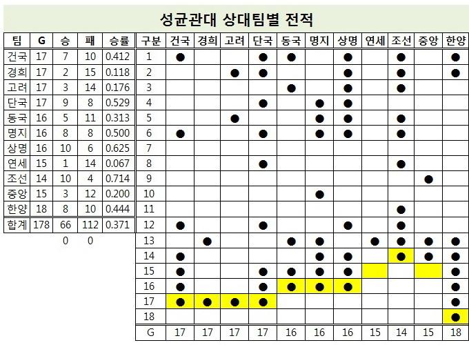 성균관대는 이 덕분에 상대팀별 맞대결에서 패배보다 승리로 2019년을 마무리했다. 현재 연패를 당하고 있는 상대는 2연패의 연세대뿐이다. 반대로 2연승 이상 기록하고 있는 건 7팀이다. 두 번이나 16전패를 당했던 성균관대에서 완전 탈피했다.