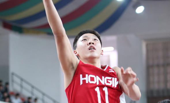 7일 광주대 체육관에서 열린 2015 연맹회장기 전국남,녀중,고농구대회 남고부 인헌고와 홍대부고의 예선경기, 홍대부고 최형욱이 엔드라인을 파고 들어 림을 향해 볼을 날리고 있다.