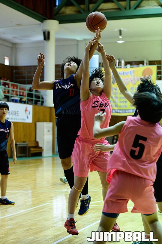 7일 광주 수피아여고체육관에서 열린 '2015 연맹회장기 전국남,녀중,고농구대회 여중부경기, 수피아여중과 동주여중의 경기, 동주여중 이경은과 수피아여중 서수민이 리비운드 경쟁을 벌이고 있다.
