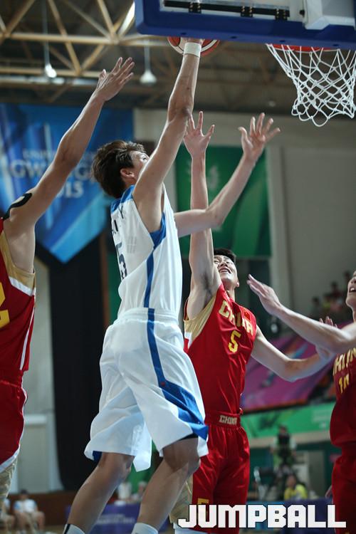 6일 광주 동강대체육관에서 열린 2015 광주 유니버시아드 남자 농구 한국과 중국의 경기, 한국의 최준용이 상대의 집중 수비를 뚫고 레이업슛으로 득점을 만들어 내고 있다.