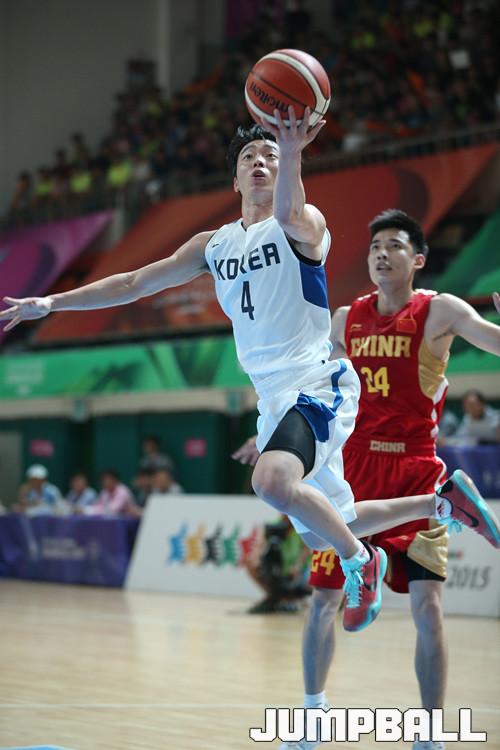 6일 광주 동강대체육관에서 열린 2015 광주 유니버시아드 남자 농구 한국과 중국의 경기, 한국의 가드 이재도가 하늘을 날아 올라 레이업슛을 시도하고 있다