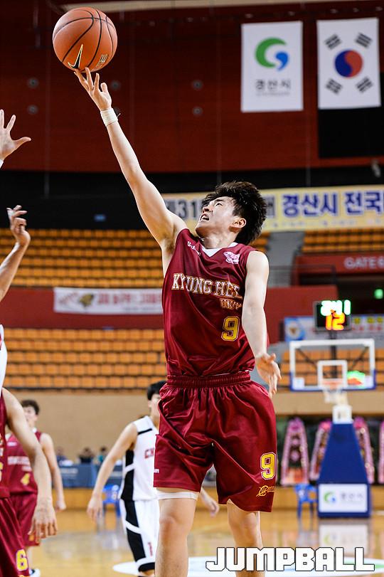 [점프볼=경산/유용우 기자] 27일 경산 실내체육관에서 열린 '제31회 MBC배 경산시 전국대학농구대회' 경희대와 조선대의 경기, 경희대 맹상훈이 레이업을 하고 있다.