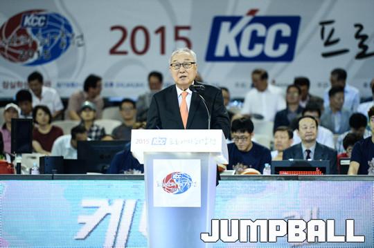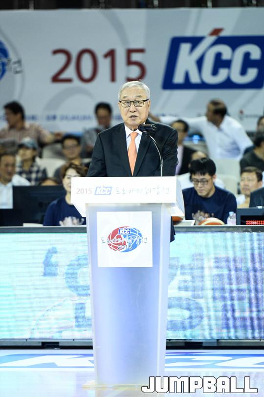 [점프볼=잠실/유용우 기자] KBL과 한국대학농구연맹이 주최하고 KBL이 주관하는 'KCC 2015 프로아마최강전'이 15일 잠실학생체육관에서 열렸다. 프로 10개팀과 대학 5개팀이 참가하였으며, 총 15경기를 진행하며 최강전을 치루게 된다. 김영기 총재가 대회 개막을 선언하고 있다.