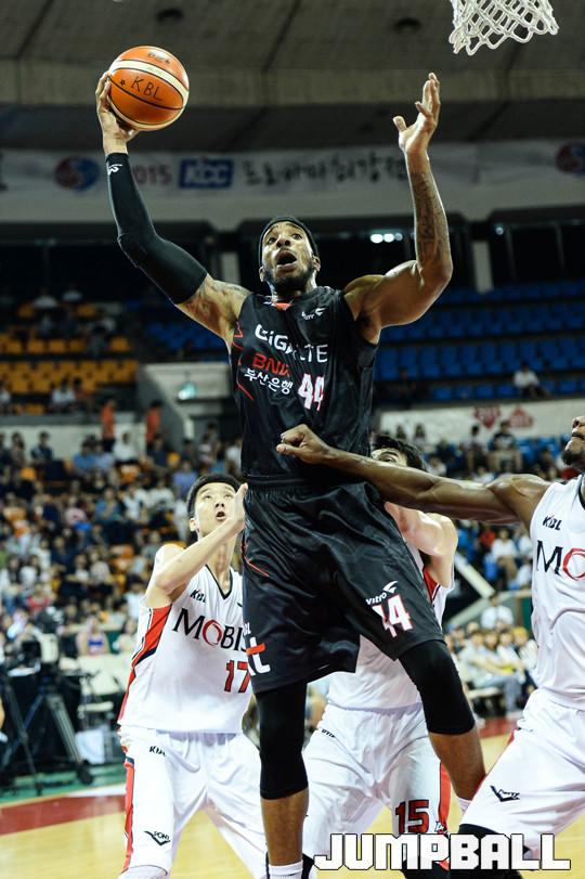 [점프볼=잠실/유용우 기자] KBL과 한국대학농구연맹이 주최하고 KBL이 주관하는 'KCC 2015 프로아마최강전'이 15일 잠실학생체육관에서 열렸다. 프로 10개팀과 대학 5개팀이 참가하였으며, 총 15경기를 진행하며 최강전을 치루게 된다. 1일차 첫경기인 부산 KT와 울산 모비스의 경기, KT 심스가 리바운드를 잡고 있다.