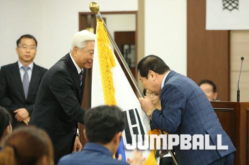 단기를 전달받는 박소흠 여자농구대표팀 단장