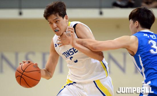 28일 연세대체육관에서 열린 2015 남녀 대학농구리그 연세대와 동국대의 경기에서 연세대 최준용이 속공을 펼치다 상대의 파울로 저지당하자 괴로운 표정을 짓고 있다.