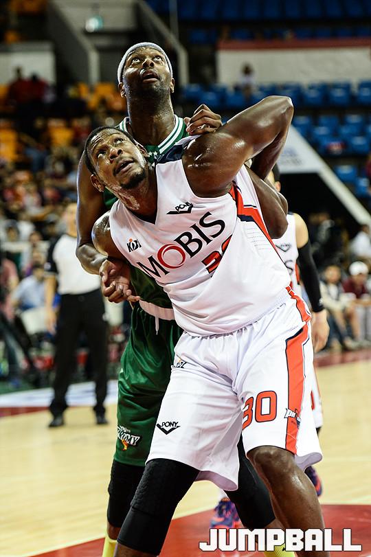 6일 잠실 학생체육관에서 열린 '2015 KCC 아시아 프로농구 챔피언쉽' 울산 모비스와 원주 동부의 결승 경기, 모비스 빅터가 동부 벤슨을 수비하고 있다.