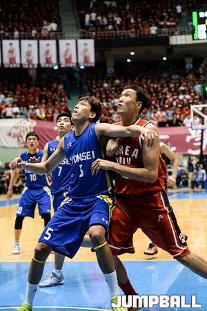 [점프볼=잠실/유용우 기자] 18일 잠실실내체육관에서 '2015 정기전' 농구경기가 열렸다. 50여 년 동안 이어진 정기전에서 고려대와 연세대는 20승 4무 20패로 팽팽히 맞서있다. 최근 4년간은 고려대가 4연승을 거뒀다. 고려대 이종현과 연세대 박인태가 루즈볼을 잡기위해 경쟁하고 있다.