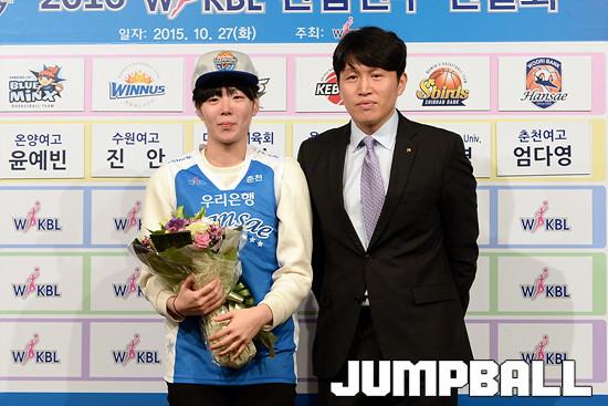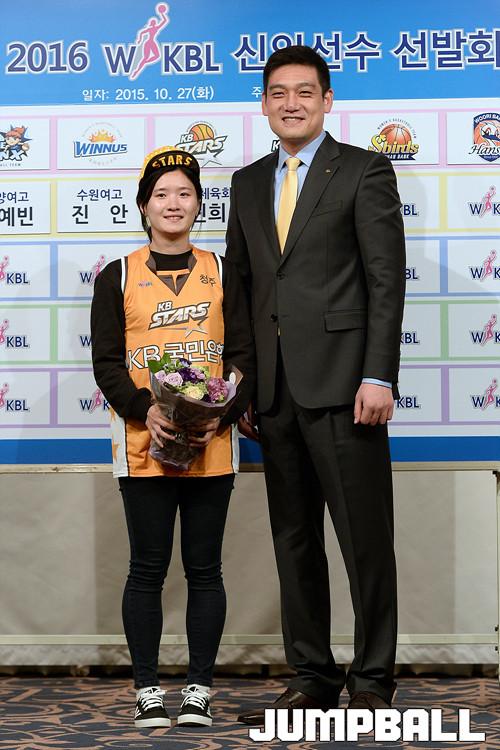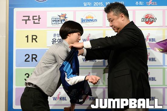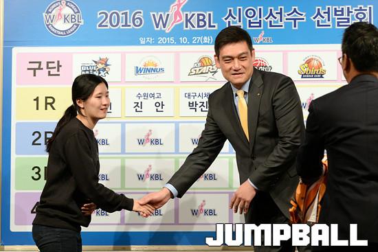 27일 서울 청담동 리베라호텔에서 열린 , 2016 WKBL 신인선수 선발회, 1라운드 추첨에 뽑힌 선수들이 단복과 모자를 쓰고 각팀 감독님들과 기념촬영을 하고있다.