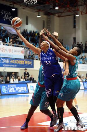 02일 용인 실내체육관에서 열린 KDB생명 2015-2016 여자프로농구 용인 삼성생명과 춘천 우리은행의 경기, 우리은행 양지희가 골밑슛을 시도할때 삼성생명의 파울로 자유투를 얻어내고있다.
