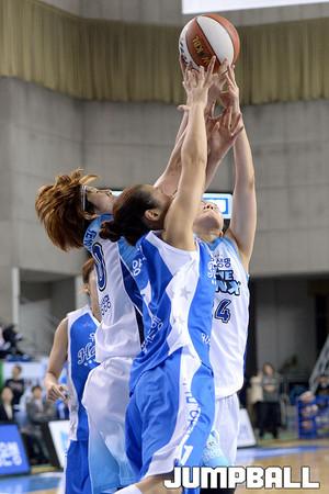 02일 용인 실내체육관에서 열린 KDB생명 2015-2016 여자프로농구 용인 삼성생명과 춘천 우리은행의 경기, 삼성생명 고아라가 우리은행 박혜진, 이승아와 리바운드를 다투고있다.