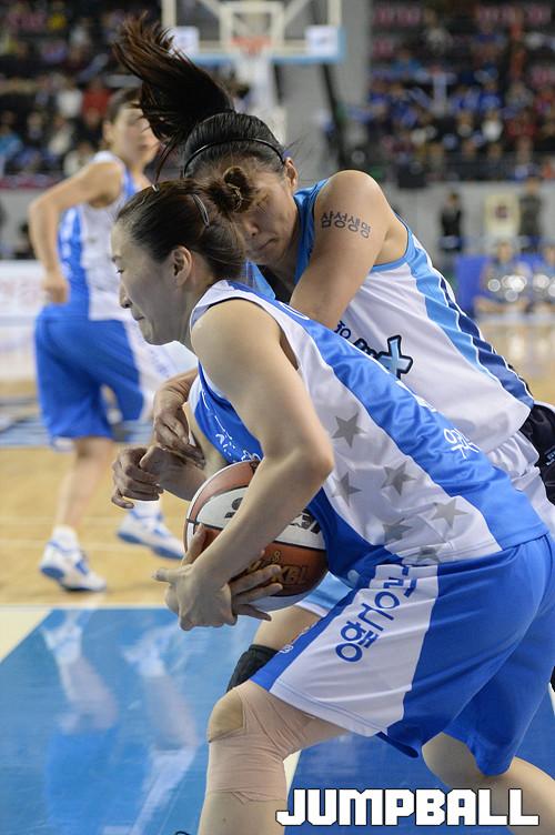 02일 용인 실내체육관에서 열린 KDB생명 2015-2016 여자프로농구 용인 삼성생명과 춘천 우리은행의 경기, 우리은행 이은혜가 삼성생명 유승희와 볼다툼을 벌이고있다.