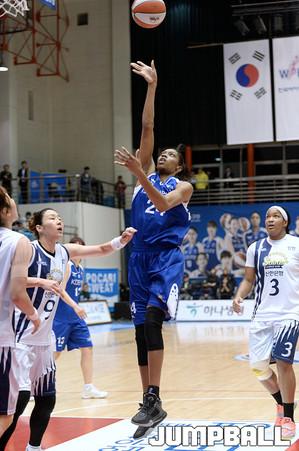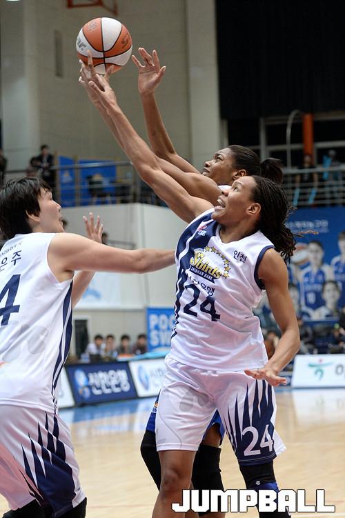 11일 구리 실내체육관에서 열린 KDB생명 2015-2016 여자프로농구 구리 KDB생명과 인천 신한은행 의 경기,신한은행 하은주와 모니크커리가 KDB생명 비키에게 전해지는 패스를 막기위해 방해를 하고있다.