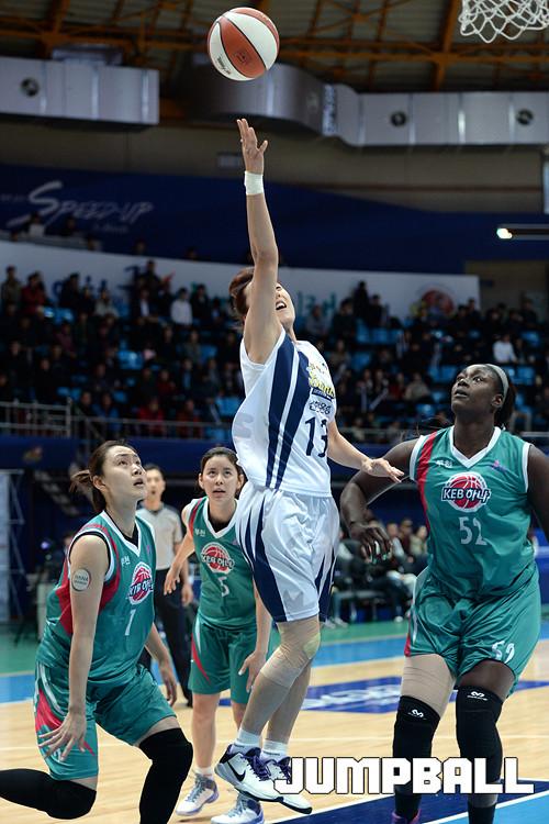 04일 인천 도원체육관에서 열린 'KDB생명 2015-2016 여자프로농구' 인천 신한은행 과 부천 하나외환 의 경기, 신한은행 김단비가 하나외환 염윤아, 첼시 리의 수비를 제치고 레이업슛을 시도하고있다.